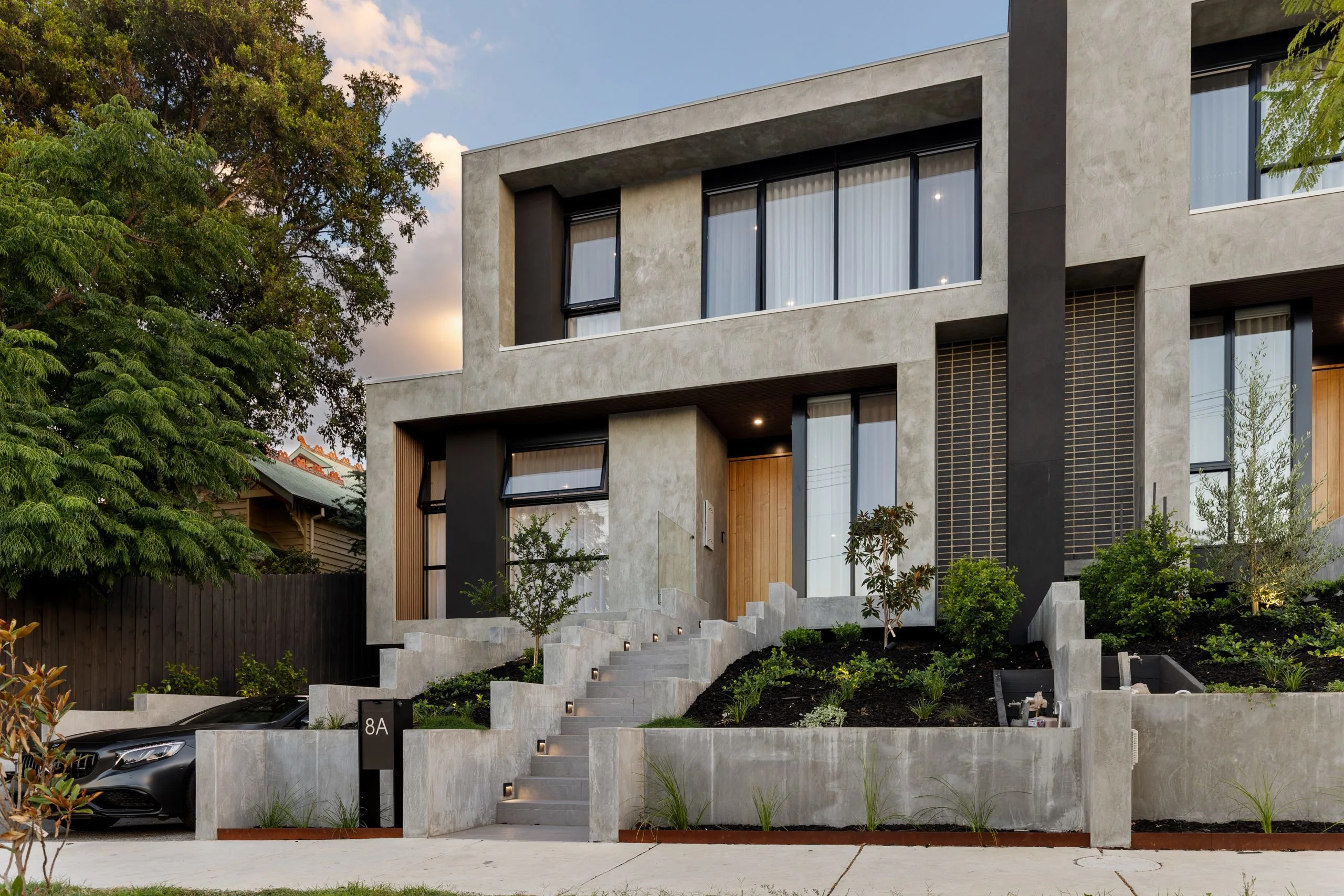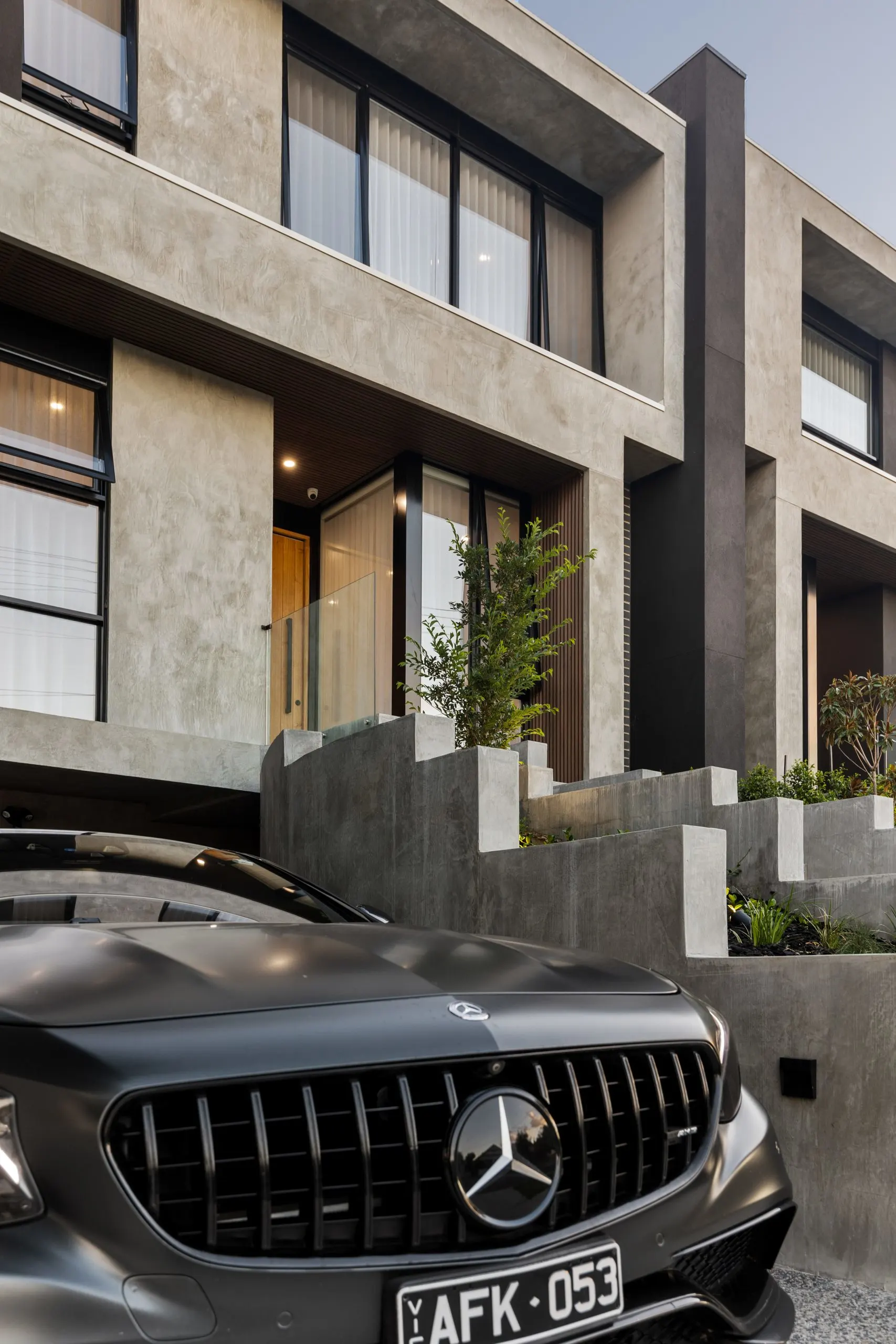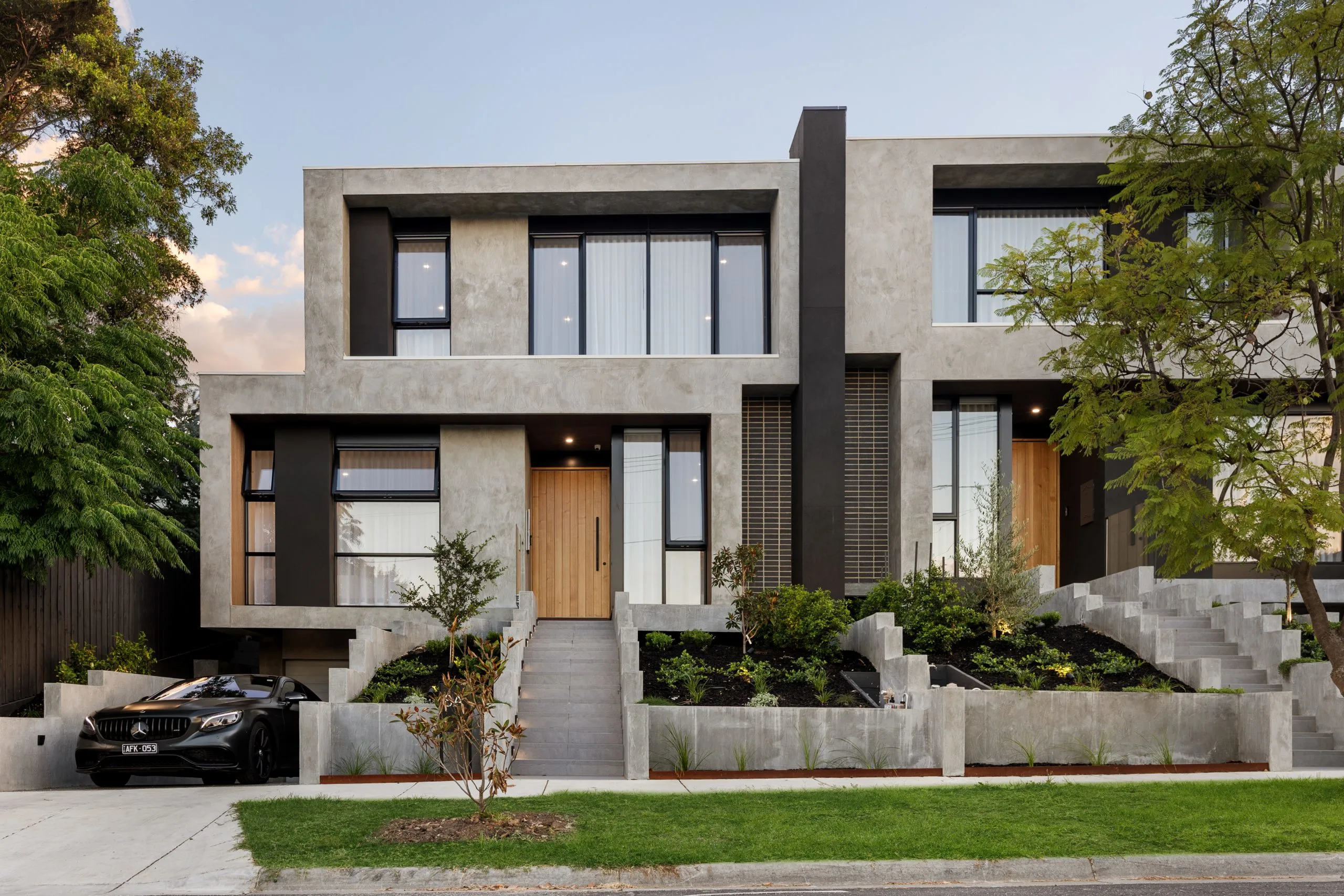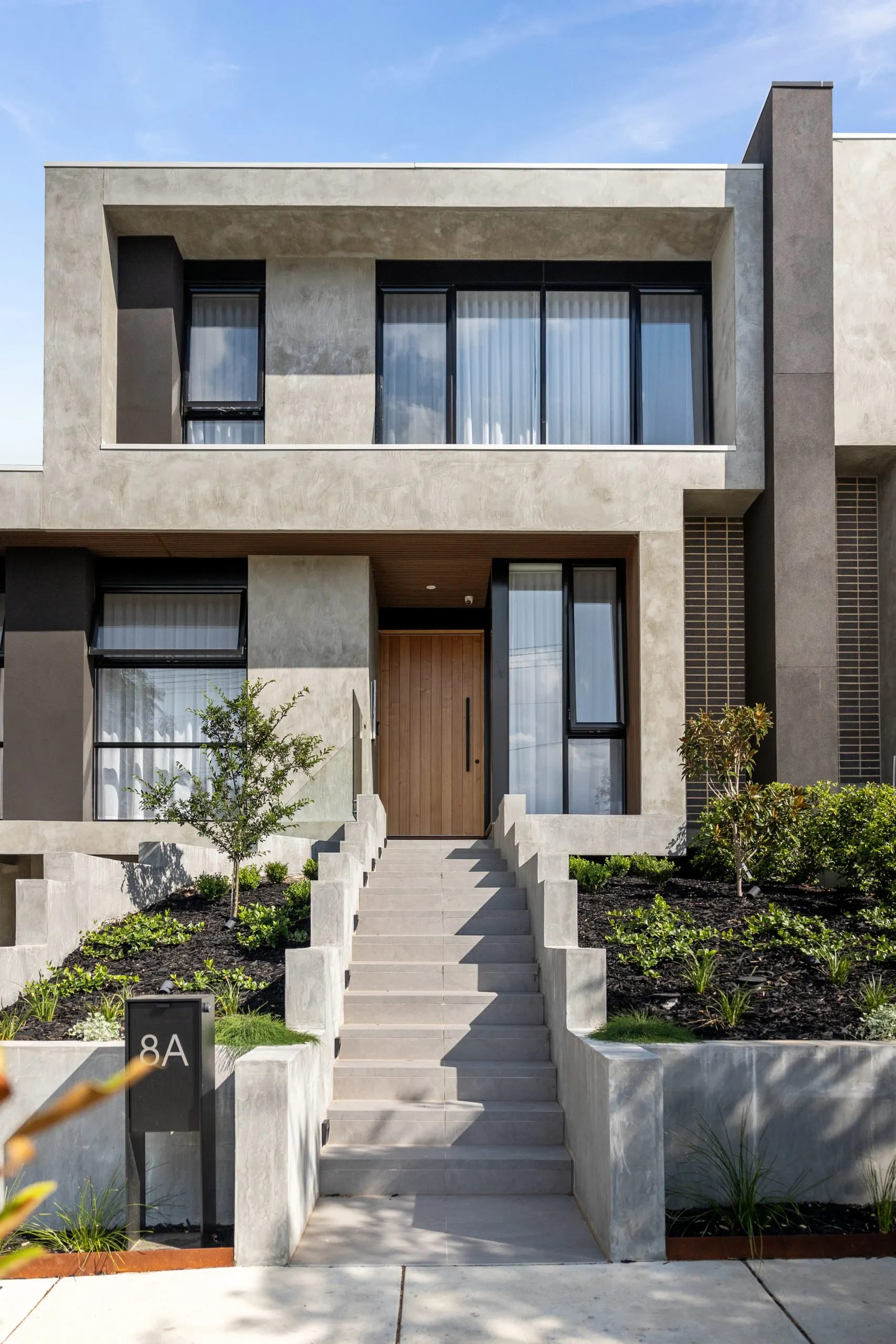 This modern duplex is all about space, style, and smart design. The concrete-finish render exterior gives it a sleek, bold look, while oversized windows flood the home with natural light and add to its striking facade.