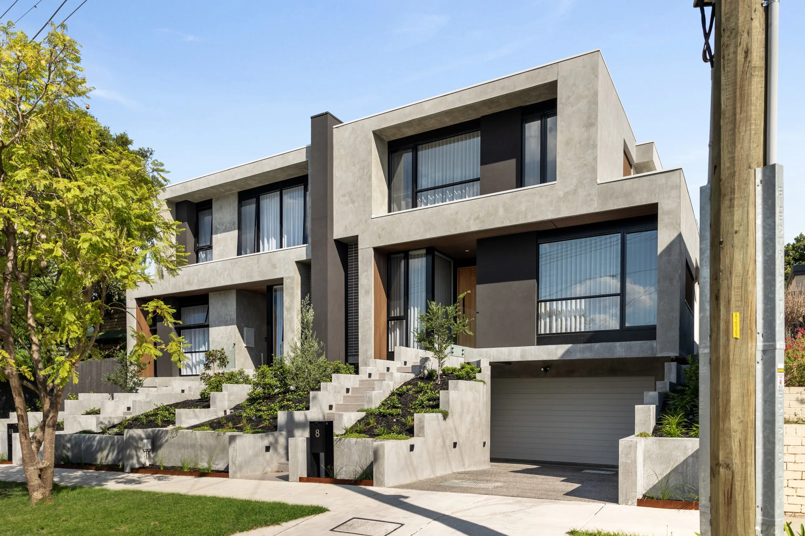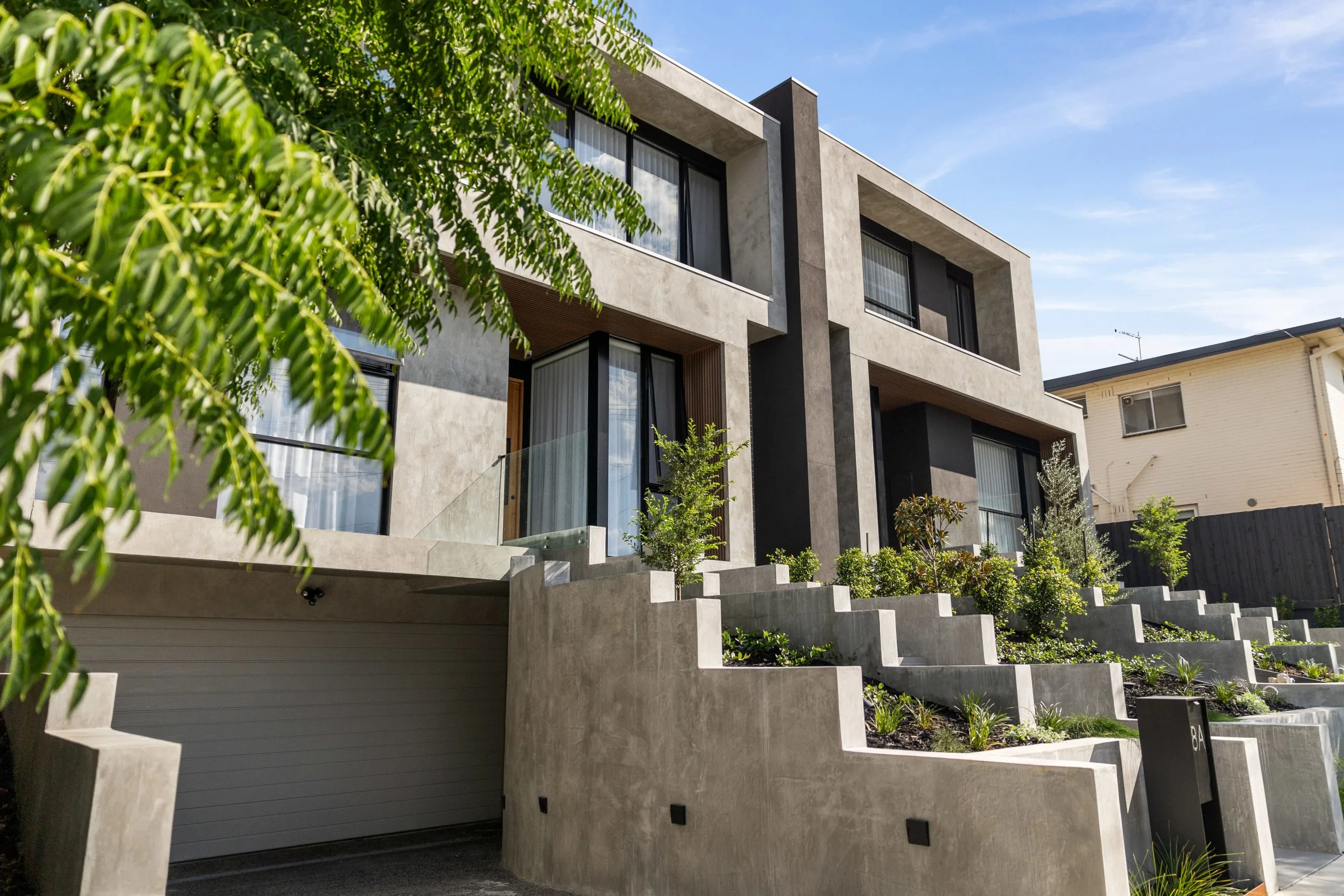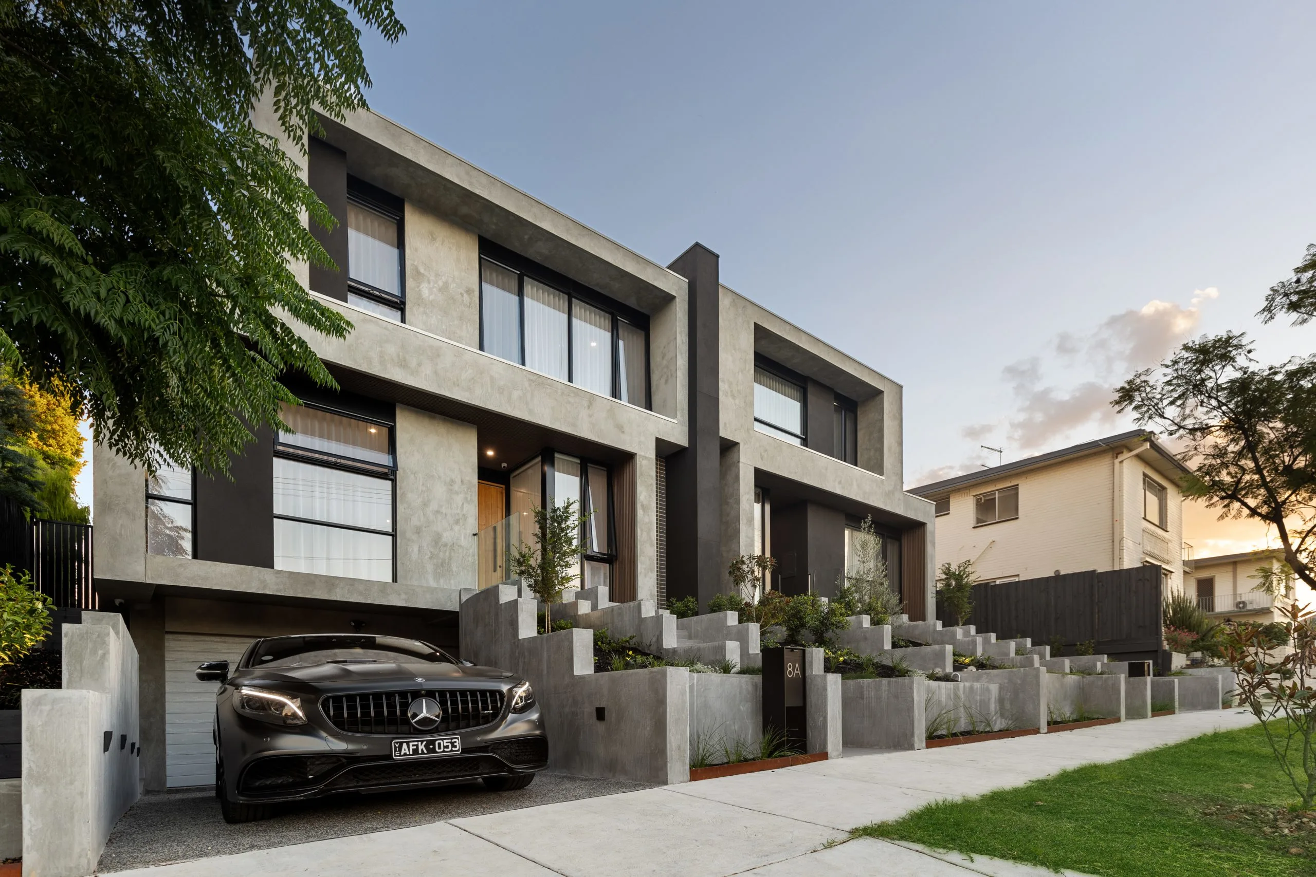 This modern duplex is all about space, style, and smart design. The concrete-finish render exterior gives it a sleek, bold look, while oversized windows flood the home with natural light and add to its striking facade.
