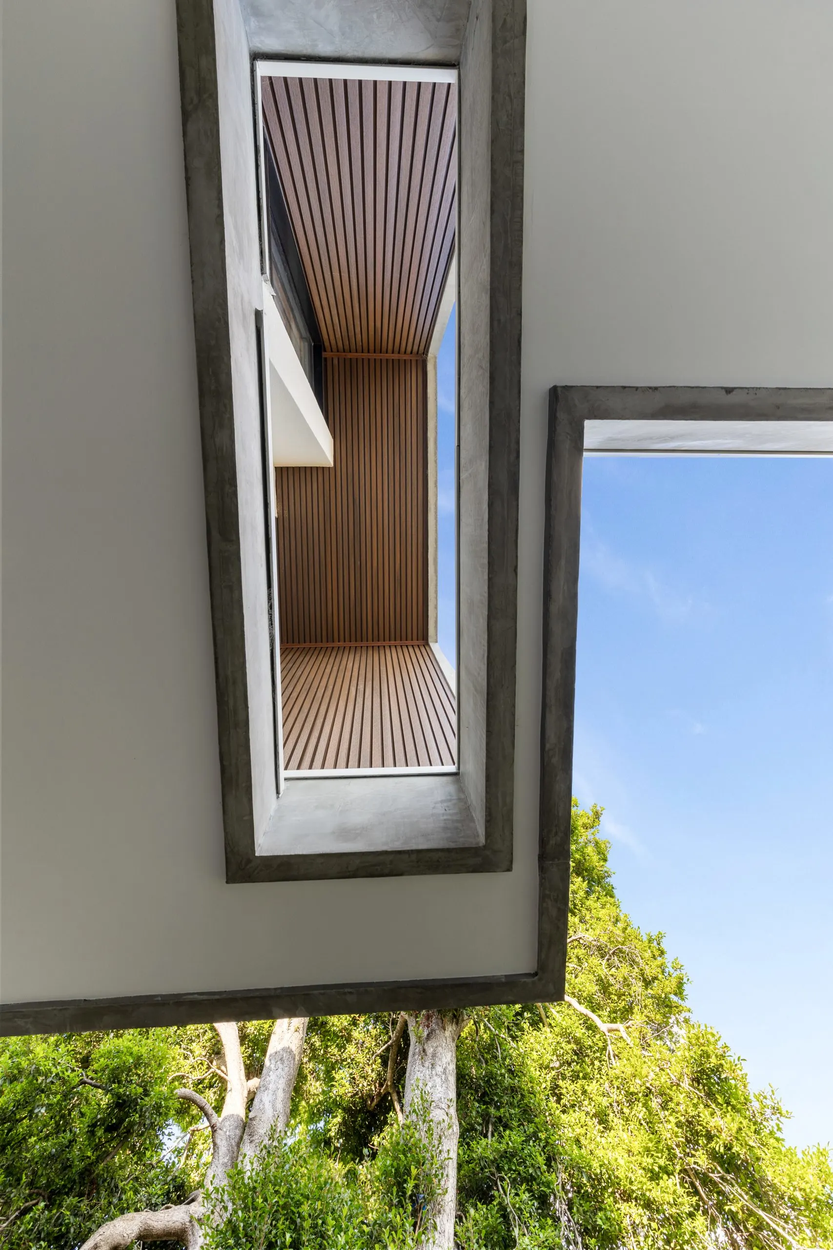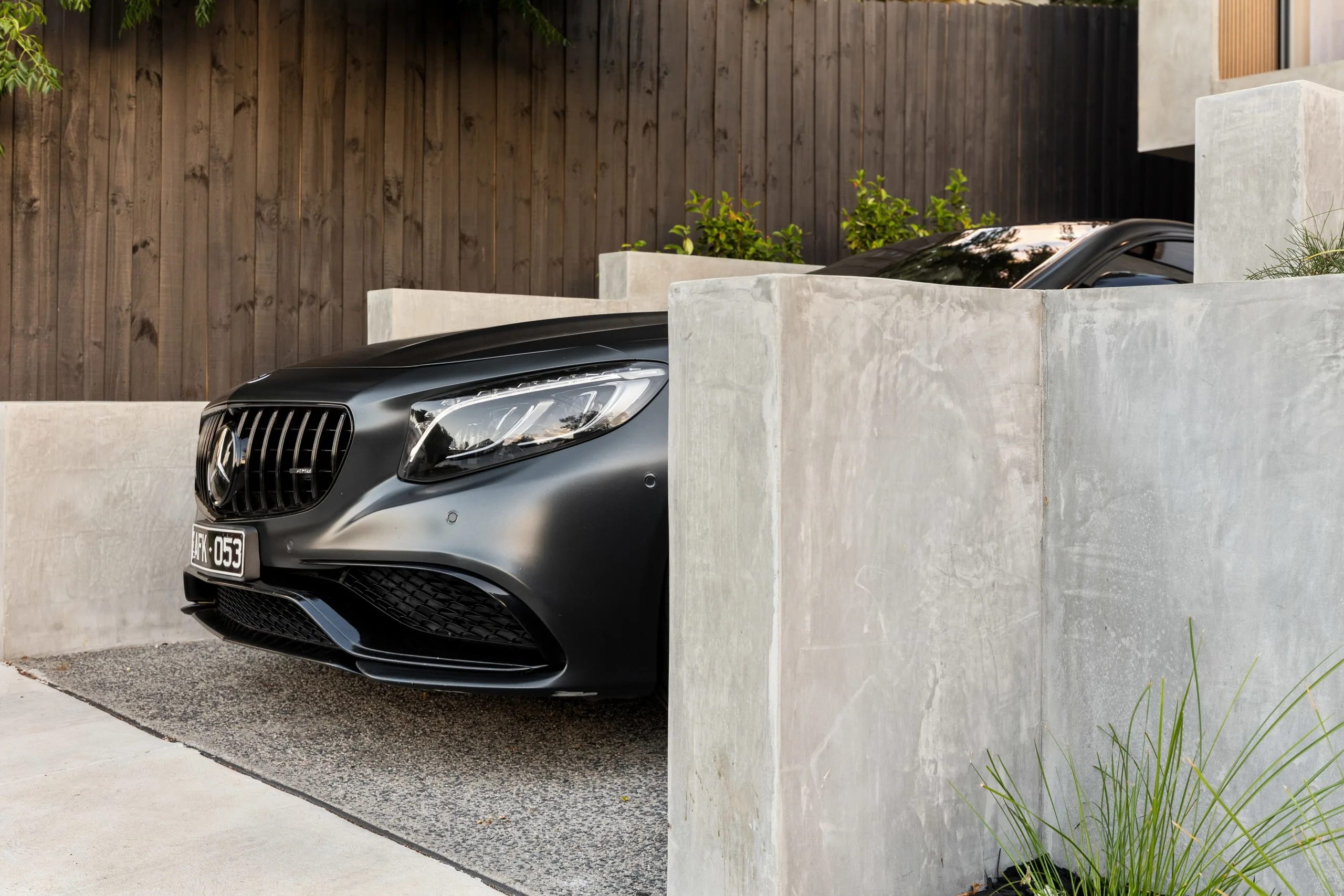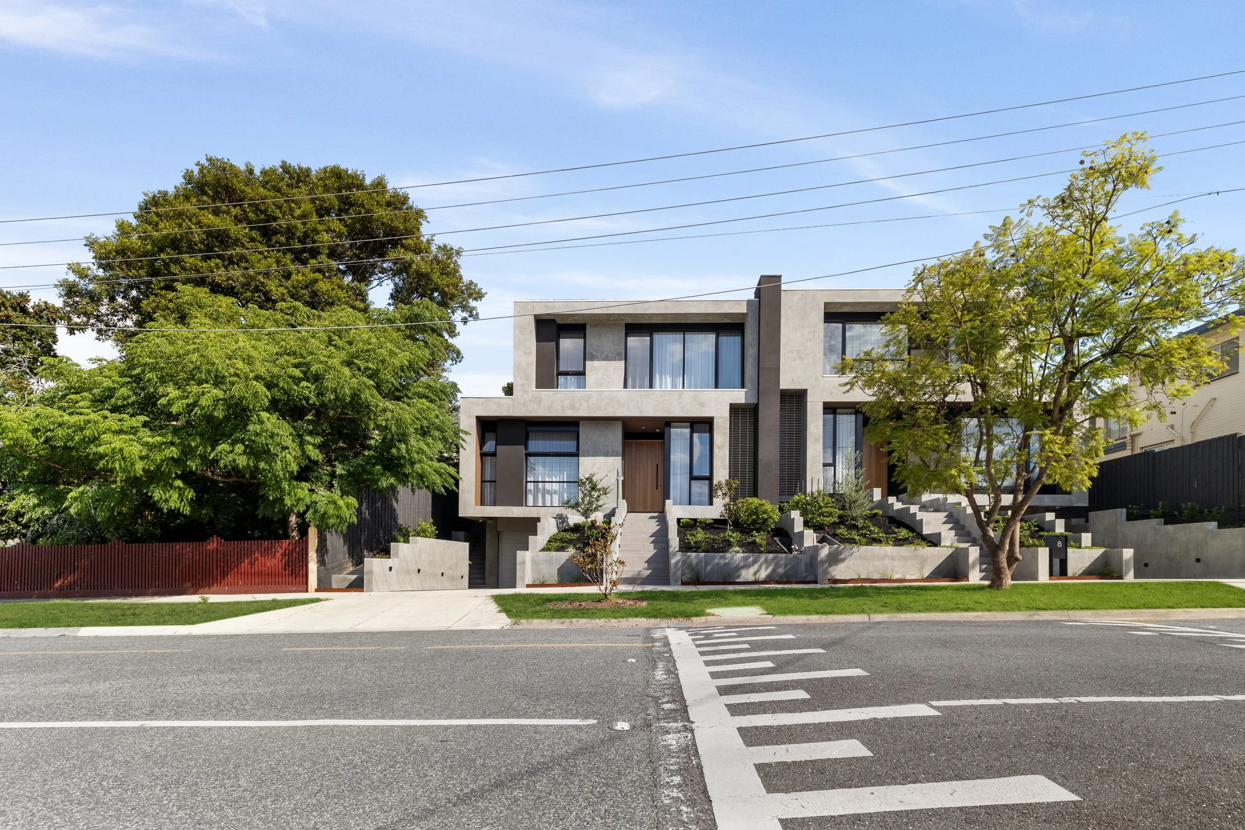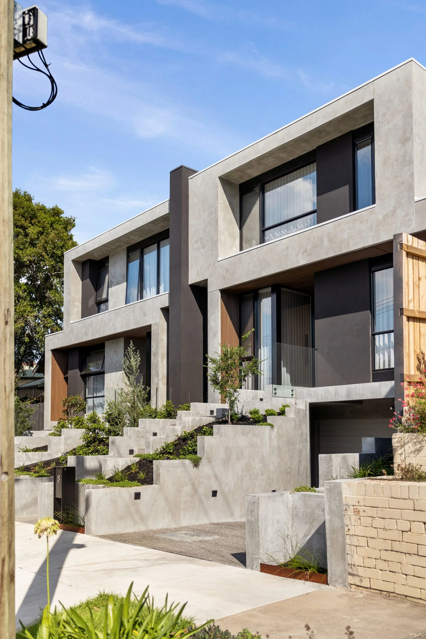This modern duplex is all about space, style, and smart design. The concrete-finish render exterior gives it a sleek, bold look, while oversized windows flood the home with natural light and add to its striking facade.
